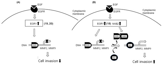 Putative schematic of EGF-EGR1-NAB2-dependent cancer cell invasion. (A) EGF-dependent EGR1 upregulation inhibits cancer progression by downregulating MMP. (B) However, EGF-dependent co-upregulation of EGR1 and NAB2 is presumed to form a complex in some cancer cells. This might result in the prevention of EGR1 binding to DNA consensus sequences, and its replacement with Sp1. Therefore, NAB2, a co-repressor of EGR1, permits EGF-mediated cancer invasion even with EGR1 upregulation.