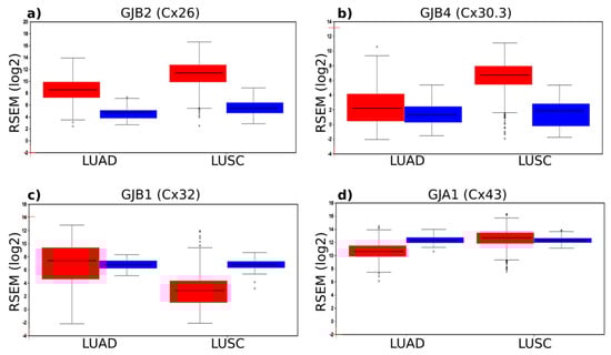 Connexin mRNA gene expression in normal tissue (blue) and in LUAD and LUSC tumours (red). (a) Expression of GJB2 (encoding Cx26). Significant upregulation is seen in both tumour subtypes, particularly LUSC. (b) Expression of GJB4 (encoding Cx30.3) is mainly upregulated in LUSC. (c) Expression of GJB2 (encoding Cx32) is specifically downregulated in LUSC. (d) Expression of GJA1 (encoding Cx43) is high in normal tissue but shows only a slight upregulation in LUAD and a slight downregulation in LUSC. The figure also highlights the occurrence of some outliers in tumours, such as very low expression of Cx26 and Cx30.3 in some LUSCs despite a general upregulation and very high expression of Cx32 in some LUSCs despite a general downregulation.