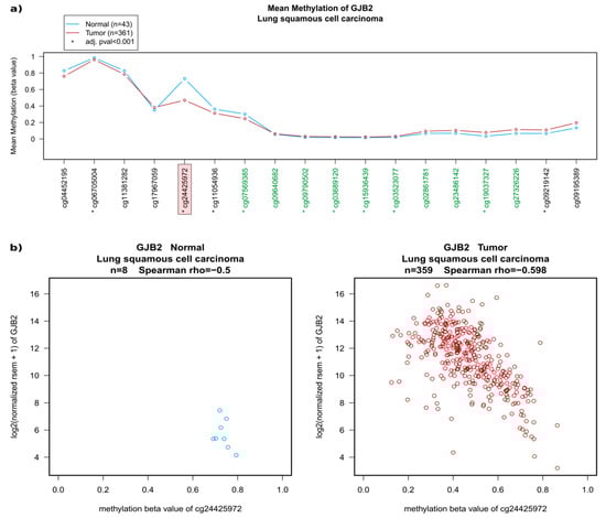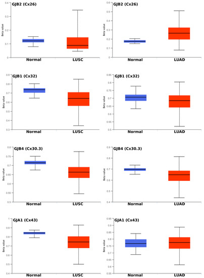 Methylation statuses of Cx26 (GJB2), Cx32 (GJB1), Cx30.3 (GJB4) and Cx43 (GJA1) in LUSC and LUAD compared with normal healthy lung tissue. The Beta value indicates the level of DNA methylation and ranges from 0 (unmethylated) to 1 (fully methylated). Different beta value cutoff values have been considered [56,57] to indicate hyper-methylation [Beta value: 0.5–0.7] or hypo-methylation [Beta value: 0.25–0.3].