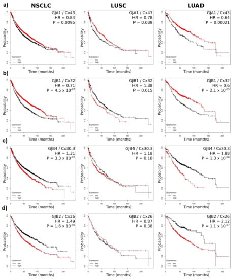 Kaplan-Meier curves of connexins known to drive lung tumorigenesis. The cohort expressing high levels of connexin mRNA is depicted in red, and the cohort with low connexin levels is in black. Probability refers to the likelihood of being alive at any time point. A hazard ratio (HR) below 1 suggests an association with better prognosis, whereas a HR above 1 suggests better prognosis (in the cohort expressing high levels of connexins). (a) Cx43; (b) Cx32; (c) Cx30.3; and (d) Cx26.