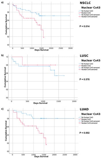 Kaplan-Meier curves based on nuclear Cx43 expression detected by immunohistochemistry of lung cancer samples. Tumours with significant nuclear Cx43 expression (over 5% of total tumours) are depicted in red and compared with the rest of the tumour samples (in blue). p-values refer to the log-rank test (Mantel-Cox analysis). Average survival times of the patient cohorts are listed. (a) NSCLC (non-small cell lung cancer, refers to the merged LUAD and LUSC groups); (b) LUSC (lung squamous cell carcinoma); (c) LUAD (lung adenocarcinoma).