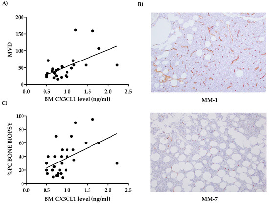 2.2. Bone Marrow CX3CL1 Levels Correlate with Bone Marrow Vascularization in Multiple Myeloma Patients