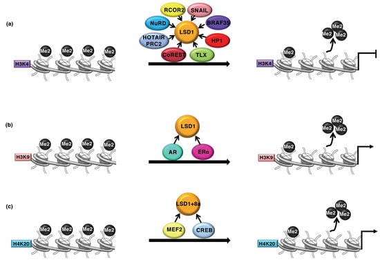 (a) Demethylase 1 (LSD1) is recruited at the target gene by a wide number of transcription factors (indicated in figure) where it promotes the transcriptional repression through demethylation of the H3K4me2 activation mark. (b) LSD1 demethylates the repressive mark H3K9me2 as coactivator with the androgen or estrogen receptor. (c) LSD1+8a, a neuronal-specific isoform, catalyzes the demethylation of the repressive mark H4K20me2, by interacting with CREB and MEF2.