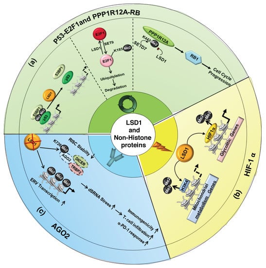 LSD1-dependent demethylation regulates activity of non-histone proteins. Effects of LSD1-mediated demethylation of non-histone proteins p53-E2F1 and PPP1R12A (a), HIF-1α (b), and AGO2 (c).