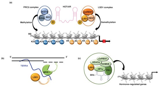 (a) HOTAIR mediates target gene silencing; it binds to PRC2 complex (EZH2, SUZ12, EEDs) and LSD1 complex (CoREST/REST) through binding at 5′ and 3′ ends, respectively, regulating trimethylation of H3K27me3 and demethylation of H3K4me2. (b) TERRA RNA modulates telomeric gene silencing through recruitment of LSD1 on uncapped telomeres, reinforcing the interaction between LSD1 and MRE11. (c) SRA interacts with the repressive complex LSD1-HP1γ-HDAC1/2-CoREST (LSD1.com) and brings this complex on target chromatin, promoting aberrant hormone-regulated gene expression.