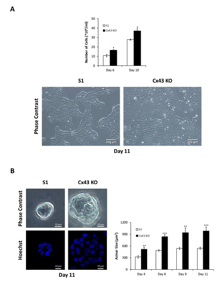 Silencing Cx43 enhances the proliferation rate of S1 cells under 2-D and 3-D culture conditions. S1 and Cx43-shRNA S1 cells (Cx43 KO) were cultured under 2-D (A) or 3-D conditions (B). Proliferation rate was assessed by cell counting on days 6 and 10 in 2-D (A; upper panel) and by measurement of acinar diameter on days 4, 6, 9, and 11 in 3-D (B; right panel). An ocular micrometer calibrated against a stage micrometer was used, and acinar areas were then calculated and plotted as acinar size. Fifty acini were analyzed per group. The values depicted in histograms are the means (±S.D.) of cell counts (A; upper panel) or acinar sizes (B; right panel) from three independent experiments. Unpaired t-test; * p < 0.05, ** p < 0.01, *** p < 0.001. Representative images of cells on day 11 in 2-D (A; lower panel) and in 3-D (B; left panel) are shown. Nuclei were stained with Hoechst (blue; B; left lower panel).