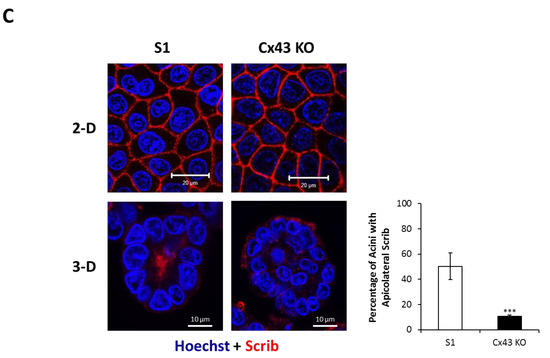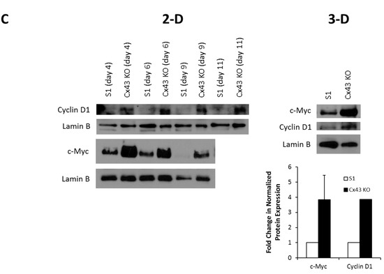 S1 and Cx43-shRNA S1 cells were plated in T-75 tissue culture flasks (2-D) or 35-mm tissue culture plates (3-D). Acini were isolated from 3-D cultures as described earlier [60]. Cells were harvested from 2-D cultures by scraping in 1 × PBS and were collected by centrifugation. Cells on days 4, 6, 9, and 11 (2-D) and acini on day 11 (3-D) were lysed, and whole cell extracts were prepared in lysis buffer (2% SDS in 1 × PBS with 10 µg/mL aprotinin, 1 mM PMSF, and 250 µM sodium fluoride) [143] or in RIPA buffer (50 mM Tris HCl, 150 mM NaCl, 1% Nonidet P-40, 0.5% sodium deoxycholate, 4% protease inhibitor cocktail and 1% phosphatase inhibitor cocktail). Proteins were quantified using the DC protein assay (Bio-Rad, Hercules, CA, USA, 5000116). For Western blot analysis, equal amounts of proteins were separated on polyacrylamide gels and transferred to polyvinylidene difluoride (PVDF) membranes that were subsequently blocked with 5% milk in tris-buffered saline-Tween 20 (TBST) and immunoblotted with the following: mouse monoclonal antibodies against c-Myc (2 μg/mL; Santa Cruz Biotechnology, sc-40), cyclin D1 (2 μg/mL; Santa Cruz Biotechnology, sc-8396), Cx43 (1 or 2 μg/mL; Santa Cruz Biotechnology, sc-271837, and 5 μg/mL; Invitrogen, 13-8300), GSK-3α/β (1 μg/mL; Santa Cruz Biotechnology, sc-7291), p-GSK-3α/β (0.5 μg/mL; Santa Cruz Biotechnology, sc-81496), p-β-catenin (2 μg/mL; Santa Cruz Biotechnology, sc-57535), ERK1/2 (1 μg/mL; Santa Cruz Biotechnology, sc-514302), and p-ERK1/2 (4 μg/mL; Santa Cruz Biotechnology, sc-7383), goat polyclonal antibodies against Scrib (1 μg/mL; Santa Cruz Biotechnology, sc-11049) and ZO-2 (2 or 4 μg/mL; Santa Cruz Biotechnology, sc-8148) and rabbit polyclonal antibodies against β-catenin (0.04 or 0.2 μg/mL; Santa Cruz Biotechnology, sc-7199) and Cx43 (2.5 μg/mL; Invitrogen, 71-0700). Secondary antibodies conjugated to HRP, goat anti-rabbit (Abcam, Cambridge, UK, ab6721), goat anti-mouse (Abcam, ab6789), and rabbit anti-goat (Abcam, ab6741), were used at 0.13 μg/mL. Equal protein loading was verified by immunoblotting for lamin B (rabbit polyclonal, 0.05 μg/mL; Abcam, ab16048) or GAPDH (mouse monoclonal, 0.4 or 1 μg/mL; Santa Cruz Biotechnology, sc-47724). Protein levels were quantified using ImageJ software and normalized to lamin B or GAPDH.