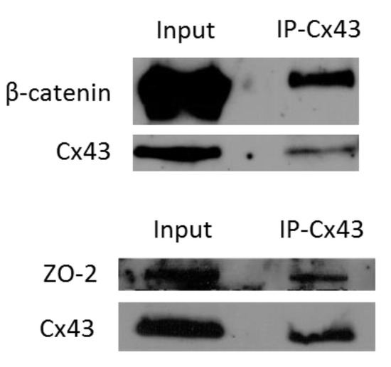 Cx43 assembles GJ complexes in S1 cells under 2-D culture conditions. S1 cells were cultured under 2-D conditions. Total proteins were extracted on day 6. Association of Cx43 and β-catenin (upper panel) or ZO-2 (lower panel) was assessed by coimmunoprecipitation (IP) of Cx43 followed by Western blotting for detection of Cx43, β-catenin and ZO-2. The input served as a control. Three independent experiments were performed for Cx43-β-catenin association and two for Cx43-ZO-2 association.