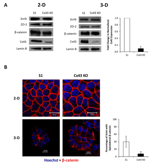 Silencing Cx43 alters the localization of junctional and polarity proteins in S1 cells under 3-D culture conditions without affecting their expression levels. S1 and Cx43-shRNA S1 cells (Cx43 KO) were cultured under 2-D or 3-D conditions. (A) Total proteins were extracted on day 9 in 2-D (left panel) and on day 11 in 3-D (right panel). Expression of Scrib, ZO-2, β-catenin, and Cx43 was assessed by Western blotting. Lamin B served as loading control. Three independent experiments were performed. The values depicted in the histogram (right panel) are the means of fold change in Cx43 expression in 3-D normalized to that of Lamin B from three independent experiments. Fold change in normalized expression is set to 1 in S1 cells. (B) Localization of β-catenin (red) was assessed by immunofluorescence on day 9 in 2-D (left upper panel) and on day 11 in 3-D (left lower panel). Nuclei were counterstained with Hoechst (blue). The values depicted in the histogram are the means (±S.D.) of acini percentages with apicolateral β-catenin from three independent experiments. One hundred acini were analyzed per group. Unpaired t-test; ** p < 0.01. (C) Localization of Scrib (red) was assessed by immunofluorescence on day 12 in 2-D (left upper panel) and on day 11 in 3-D (left lower panel). Nuclei were counterstained with Hoechst (blue). The values depicted in the histogram are the means (±S.D.) of acini percentages with apicolateral Scrib from three independent experiments. One hundred acini were analyzed per group. Unpaired t-test; *** p < 0.001.