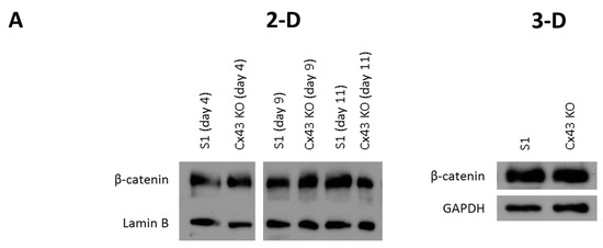S1, Cx43-shRNA S1, and T4-2 cells were plated in 35-mm tissue culture plates (3-D). Acini and tumor nodules were isolated from 3-D cultures as previously described [60], and subcellular fractionation was performed using the Qproteome Cell Compartment Kit (Qiagen, Hilden, Germany, 37502) following the manufacturer’s instructions. The nuclear fractions of acini on day 7 (T4-2) or day 11 (S1 and Cx43-shRNA S1) were quantified and analyzed by Western blotting using rabbit polyclonal β-catenin antibody (0.2 μg/mL; Santa Cruz Biotechnology, sc-7199). Equal protein loading was verified by immunoblotting for lamin B (rabbit polyclonal, 0.2 μg/mL; Abcam, ab16048). The purity of nuclear fractions was assessed by immunoblotting for GAPDH (mouse monoclonal, 0.4 μg/mL; Santa Cruz Biotechnology, sc-47724) and Tim23 (mouse monoclonal, 1 μg/mL; Santa Cruz Biotechnology, sc-514463), a membrane marker.