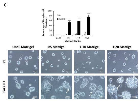ERK1/2 signaling is known to regulate cell motility and invasion in addition to proliferation [72,73,74]. Random motility was significantly enhanced in cultures of Cx43-shRNA S1 cells compared to control cells, as time-lapse imaging of random 2-D migration revealed (Movies 1,2). Specifically, quantitative analysis showed 41% increase in the total distance traveled by Cx43-shRNA S1 cells compared to control cells over time (Figure 6A). In transwell cell invasion assay, Cx43-shRNA S1 cells showed a significant increase of four-fold in the number of Matrigel-invading cells compared to control cells (Figure 6B; upper panel). In addition, invadopodia-like actin-rich dots were evident in 2-D cultures of Cx43-shRNA S1 cells (Figure 6B; lower panel). Both control and Cx43-shRNA S1 cells formed spheroid acini when cultured on undiluted Matrigel and did not display an apparent invasive behavior. In vitro studies revealed that ECM stiffening triggers an invasive phenotype in normal, oncogene-initiated and malignant mammary epithelial cells [75,76,77]. Compared to normal tissues, breast tumors are associated with increased ECM stiffness, which correlates with aggressive subtypes [78]. However, matrix stiffness was found to enhance matrix metalloproteinase (MMP) activity in a pancreatic cancer cell line [79], suggesting that motility and invasion of cancer cells require permissive, or reduced, ECM stiffness. This is in line with a recent demonstration of enhanced motility in breast cancer cells on matrices with moderate or low stiffness [80]. Thus, we found it reasonable to study the effects of Cx43 loss on the behavior of S1 cells in the context of variable ECM stiffness. For this purpose, we utilized 3-D cultures with different Matrigel concentrations (undiluted, 1:5, 1:10, and 1:20 dilutions). Matrix stiffness and network density are altered in response to the concentration of the Matrigel [81]. While S1 cells maintained their spheroid acinar morphology, Cx43-shRNA S1 cells displayed loss of this characteristic morphology under conditions of diluted Matrigel (1:5, 1:10 and 1:20). Indeed, Cx43-shRNA S1 acini showed progressive morphological alterations over the culture period, with an increase in size and acquisition of granular edges marked by the presence of migrating cells (Figure 6C; lower panel). We used the term “nonspheroid” to describe all observed patterns of dysmorphic structures. Such structures represented 53% and 58% of Cx43-shRNA S1 cultures on 1:5 and 1:10 diluted Matrigel, respectively, and predominated in cultures on 1:20 diluted Matrigel by day 11, forming 76% of the population of multicellular structures. The percentages of nonspheroid structures in control S1 cultures were negligible under all conditions and did not exceed 4% (Figure 6C; upper panel). These results indicate that the loss of Cx43 induces the acquisition of an invasive phenotype in S1 cells in a context-dependent manner and highlight the integration of Cx and ECM signals in determining mammary epithelial morphology and behavior. Importantly, the lumen-forming ability of control S1 cells was recapitulated under conditions of 1:5 diluted Matrigel, while a significant loss of lumen formation was noted in cultures on 1:10 and 1:20 diluted Matrigel (Figure 7A). In addition, the percentages of S1 acini with apicolateral Scrib localization did not differ between cultures on undiluted and 1:5 diluted Matrigel (Figure 7B). Since the 3-D conditions of 1:5 diluted Matrigel favored an invasive phenotype in Cx43-shRNA S1 cells while maintaining normal morphology in control cells, it becomes possible to further assess the role of Cx43 loss in invasion of S1 cells under permissive ECM stiffness.