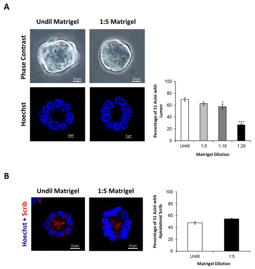 S1 cells maintain their characteristic spheroid morphology, lumen-forming ability, and polarity under 3-D culture conditions of reduced ECM stiffness. S1 cells were cultured under 3-D conditions atop of different Matrigel dilutions (undiluted, 1:5, 1:10 and 1:20 dilutions). Lumen formation (A) and polarity (B), demonstrated by apicolateral Scrib localization (red; B; left panel), were assessed by immunofluorescence on day 11. (A) Fifty acini were analyzed per condition. The values depicted in the histogram (right panel) are the means (±S.D.) of acini percentages with lumen from three independent experiments. Unpaired t-test; * p < 0.05, *** p < 0.001. Representative images of acini (left panel) are shown. Nuclei were stained with Hoechst (blue; left lower panel). (B) Sixty-seven acini were analyzed per condition. The values depicted in the histogram (right panel) are the means (±S.D.) of acini percentages with apicolateral Scrib from two independent experiments. Unpaired t-test. Representative images of acini (left panel) are shown. Nuclei were counterstained with Hoechst (blue). Undil; Undiluted.