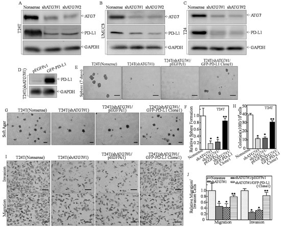 PD-L1 acted as an ATG7 downstream mediator being responsible for ATG7-promoted stem-like property, invasion, and anchorage-independent growth in human high invasive BC cells. (A–C) T24T, UMUC3, T24 cells were stably transfected with ATG7 knockdown constructs (#1 & #2), respectively. Western Blot was used to assess the ATG7 protein knockdown efficiency and its effects on other protein expression. (D) The GFP-tagged PD-L1 overexpression plasmid was stably transfected into T24T(shATG7#1) cells. (E,F) The indicated cells were subjected to determination of sphere formation abilities according to the manufacturer’s instruction, the number of spheroid formed cells were counted as described in the section of “Materials and Methods”. The asterisk (*) indicates a significant decrease in comparison to scramble nonsense transfectant (* p < 0.05), while the symbol (**) indicates a significant increase in comparison to T24T(shATG7#1/pEGFPc1) cells (** p < 0.05). (G,H) The indicated cells were subjected to anchorage-independent soft agar assay using the protocol described in the section of “Materials and Methods”. Representative images of colonies of indicated cells were photographed under an Olympus DP71 (G). The number of colonies was counted with more than 32 cells of each colony and the results were presented as colonies per 104 cells, and the bars show mean ± SD from three independent experiments (H). The asterisk (*) indicates a significant decrease in comparison to scramble nonsense transfectant (* p < 0.05), while the symbol (**) indicates a significant increase in comparison to T24T(shATG7#1/pEGFPc1) cells (** p < 0.05). (I) Invasion abilities of the indicated cells were determined using BD BiocoatTM matrigelTM invasion chamber. The migration ability was determined using the empty insert membrane without the matrigel, while the invasion ability was evaluated using the same system except that the matrigel was applied. (J) The invasion ability was normalized to the insert control according to the manufacturer’s instruction. The asterisk (*) indicates a significant inhibition in comparison to T24T(Nonsense) cells (* p < 0.05), while the symbol (**) indicates a significant increase in comparison to T24T(shATG7#1/pEGFPc1) (** p < 0.05). Scale bars in (E,I) = 200 μm, Scale bars in (G) = 500 μm.