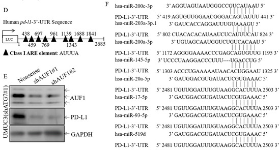ATG7 inhibition destabilized pd-l1 mRNA by attenuating its 3′UTR activity in human BC cells. (A) Real-time PCR was applied to compare the mRNA levels of pd-l1 among T24T(shATG7#1), T24T(shATG7#2) and T24T(Nonsense) cells, and gapdh was used as internal control. (B) T24T(shATG7#1), T24T(shATG7#2), and T24T(Nonsense) cells were seeded into 6-well plates. After synchronization, the cells were used to determine pd-l1 mRNA stability in the presence of Actinomycin D (Act D) by using Real-time PCR. gapdh was used as internal control. (C) The pMIR-pd-l1 3′-UTR reporter was transiently transfected into the indicated cells and luciferase activity of each transfectant was evaluated. The luciferase activity was presented as a relative to nonsense transfectant with normalized by using pRL-TK as an internal control. The bars show mean ± SD from three independent experiments. The symbol (*) indicates a significant decrease in T24T(shATG7) cells as compared to nonsense transfectant (* p < 0.05). (D) The predicted Class I ARE element on the 3′-UTR of pd-l1 mRNA. (E) Cell lysates extracted from the indicated cells were subjected to Western Blot to determine AUF1, and PD-L1 protein expression, GAPDH was used as a protein loading control. (F) The potential microRNAs binding sites in 3′-UTR of pd-l1 mRNA were analyzed by the TargetScan, Pictar and miRANDA database.
