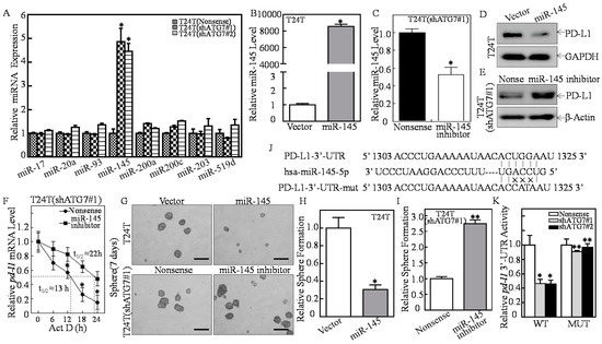Based on the results shown in the above studies, Real-time PCR was performed to evaluate the miRNAs expressions as indicated in Figure 2F. As shown in Figure 3A, miR-145 was found to be the only one that was upregulated in T24T(shATG7) cells. To determine the potential effect of miR-145 on ATG7 regulation of PD-L1 expression, a construct expressing miR-145 or miR-145 inhibitor was transfected into T24T or T24T(shATG7#1) cells as shown in Figure 3B,C. MiR-145 ectopic expression resulted in a dramatical decrease of PD-L1 protein expression (Figure 3D), while miR-145 inhibition remarkably promoted PD-L1 protein expression (Figure 3E). These results revealed that miR-145 played an essential role in ATG7 promotion of PD-L1 expression. Further, miR-145 ectopic expression inhibited the sphere formation of T24T cells, while the inhibition of miR-145 in T24T(shATG7#1) cells markedly promoted the sphere formation and increased pd-l1 mRNA stability (Figure 3F) in T24T(shATG7#1/miR-145 inhibitor) cells as compared with T24T(shATG7#1/Nonsense) (Figure 3G–I). To detect whether miR-145 could directly bind to pd-l1 mRNA 3′-UTR, as indicated in Figure 3J, we constructed the miR-145 binding site mutation in pd-l1 3′-UTR-luciferase reporter. The results exhibited that pd-l1 3′-UTR luciferase activity was decreased in T24T(shATG7) cells, whereas the mutation luciferase reporter completely reversed this inhibition in ATG7 knockdown transfectant T24T(shATG7) (Figure 3K). Collectively, our results reveal that the direct binding of miR-145 to pd-l1 3′-UTR is important for miR-145 destabilization of pd-l1 mRNA. Thus, ATG7 overexpression inhibits miR-145 expression, which subsequently binds to pd-l1 3′-UTR and results in pd-l1 mRNA stabilization, and in turn enhancing human BC sphere formation.