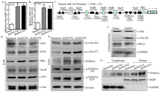To explore the mechanisms of the ATG7 impairing miR-145, we tested the pre-miR-145 expression level and miR-145 promoter activity. The results showed that both pre-miR-145 expression and miR-145 promoter activity were markedly elevated in ATG7 knockdown transfectants (Figure 4A,B), indicating ATG7 regulation of miR-145 expression at the transcription level. Therefore, we bioinformatically analyzed and evaluated the expression of the potential transcriptional factors, which could bind to the -1548 to -30 region of the miR-145 promoter (Figure 4C). Results indicated that knockdown of ATG7 consistently promoted FOXO3a protein expression and c-Jun phosphorylation at Ser63/73, while it did not show consistent effect on other transcription factors, such as Stat5, ETS1, ELK1, JunB and C-Fos (Figure 4D,E), suggesting that FOXO3a or c-Jun might be involved in ATG7 inhibition of miR-145 expression. To explore the potential role of c-Jun, dominant negative mutant Jun (TAM67) was stably transfected into T24T(shATG7#1) cells. As shown in Figure 4F, the introduction of TAM67 had no observable effect on PD-L1 protein expression, excluding the possible involvement of c-Jun in ATG7 promotion of PD-L1 expression. We further detected the effects of ATG7 knockdown on FOXO3a nuclear translocation by using a nuclear/cytosol fractionation assay. The results showed that knockdown of ATG7 resulted in the marked translocation of FOXO3a from cytoplasmic to nuclear in comparison to T24T(Nonsense) cells (Figure 4G), suggesting FOXO3a activation in ATG7 knockdown cells.