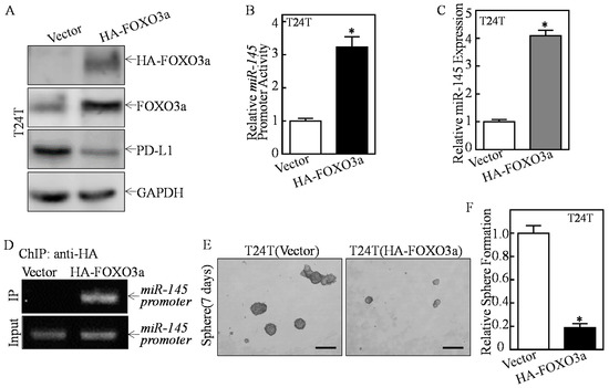 FOXO3a was an ATG7-regulated transcription factor mediating miR-145 downregulation in human BCs. (A) HA-tagged FOXO3a construct was stably transfected into T24T cells. The FOXO3a overexpression efficiency and its downstream PD-L1 expression were assessed by Western Blot. GAPDH was used as a protein loading control. (B,C) The miR-145 promoter-driven luciferase reporter together with TK reporter was transfected into the indicated cells. Luciferase activity of each transfectant and miR-145 expression were evaluated and the bars show mean ± SD from three independent experiments. The asterisk (*) indicates a significant increase as compared with Vector transfectant (* p < 0.05). (D) 1 × 106 T24T cells were seeded into 10-cm dish. After the cell density reached 80–90%, ChIP assay was performed with anti-FOXO3a antibody to determine FOXO3a binding to the motifs between −779 and −600 bp of the miR-145 promoter. (E,F) The indicated cells were subjected to determination of sphere formation abilities according to the manufacturer’s instruction, the number of spheroid formed cells were counted as described in the Materials and Methods section. The asterisk (*) indicates a significant decrease in comparison to scramble Vector transfectant (* p < 0.05). Scale bars in (E) = 200 μm.