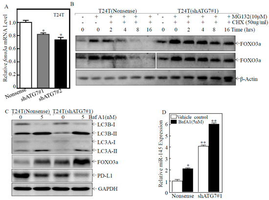 ATG7 promoted autophagic removal of FOXO3a protein. (A) Real-time PCR was used to detect foxo3a mRNA expression in the indicated cells. The asterisk (*) shows a significant inhibition in comparison to scramble nonsense transfectant (* p < 0.05). (B) FOXO3a protein stability was evaluated in the presence of cycloheximide (CHX) for the indicated times in T24T(shATG7#1) andT24T(shATG7#2) cells in comparison to that in T24T(nonsense) cells. (C,D) T24T(shATG7#1), T24T(shATG7#2), and T24T(nonsense) cells were treated with or without Baf A1 for 24 h, and the cell extracts were subjected to Western Blot to detect protein expression or Real-time PCR to determine miR-145 expression, as indicated. * p < 0.05; ** p < 0.05.