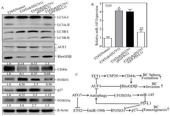 A positive feedback loop was formed to promote PD-L1 expression and ATG7/autophagy downstream effects in human BC cells. (A) T24T(shATG7#1) cells were stably transfected with the GFP-tagged PD-L1 overexpression plasmid, Western Blot was performed to determine the conversion of LC3 from LC3-I to LC3-II and the expression of AUF1, RhoGDIβ, CD44s, FOXO1, p27, and FOXO3a. β-Actin was used as a protein loading control. (B) Real-time PCR was performed to evaluate miR-145 expression in the indicated cells. * p < 0.05; ** p < 0.05. (C) The proposed mechanisms underlying ATG7 overexpression in the promotion of PD-L1 expression and human BCs stem-like property, invasion, and tumorigenesis.