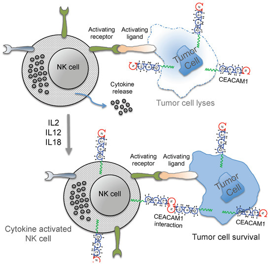 Tumors have developed several mechanisms to escape from immune surveillance. On the tumor cell surface, CEACAM1 has been shown to interact directly with CEACAM1 on NK cells and tumor-infiltrating lymphocytes (TIL), leading to functional inhibition of those cells [101,102,103,104]. Following activation, it is mainly the CD16-negative NK subset that expresses CEACAM1 and cells expressing the CEACAM1 are protected from lysis by CEACAM1-positive NK cells [101,105]. It is important to note that, while freshly isolated T- and B-cells express very low amounts of CEACAM1, freshly isolated NK cells were CEACAM1 negative [106]. However, the CEACAM1 expression on NK cells (and T cells) depends on their differentiation stage and can be strongly enhanced by activation with interleukin-2 (IL-2), IL-12 and IL-18, which may lead to distinct regulatory mechanisms of the functional subpopulations of NK cells (Figure 2) [107,108]. The central meaning of the homophilic CEACAM1 interaction in trans was also supported by reports showing that CEACAM1 positive NK cells inhibited cytolysis of CEACAM1 expressing tumor cells by impairing NKG2Ds ability to stimulate cytolysis. Additionally, evidence has amassed that CEACAM1 is involved in the regulation of the NKG2D-ligand expression [72,101,109]. Indeed, CEACAM1 can down-regulate MICA/B and ULBP1 from the tumor cell surface thus influencing their immunogenicity [110,111]. Several studies have shown that soluble NKG2D-ligands derived from cancer cells by alternative splicing [19], proteolytic shedding [20,21,22,23], or exosome secretion [24] can impair NKG2D-mediated cytotoxicity by negatively regulating NKG2D surface expression.