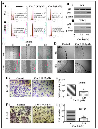 Cell cycle arrest is an attractive target for the management of various types of cancers [18]. Thus, to examine the effect on cell cycle distribution, PrCa cells were treated with Cuc D (0.5 and 1 µM) and analyzed by flow cytometry. Result showed a dose-dependent increase of Cuc D treated PC3 (Figure 2Ai) and DU145 (Figure 2Aii) cells in the G2/M phase. Further, to gain insight into cell cycle arrest by Cuc D, we also studied the effect of Cuc D on cell cycle inhibitory proteins (p21 and p27). As shown in Figure 2, Cuc D treatment (0.1 and 0.5 µM) dose-dependently up-regulated the expression of p21 and p27 in PC3 (Figure 2Bi) and DU145 (Figure 2Bii) cells as revealed by western blot analysis.