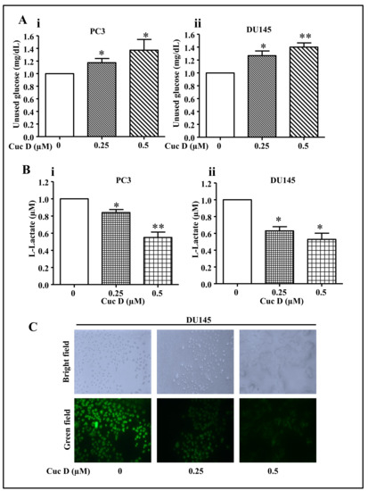 Effect of Cuc D on glucose uptake and lactate secretion by PrCa cells. (A) Effect of Cuc D on glucose uptake by PrCa cells as determined by glucose colorimetric assay kit (Cayman Chemicals, Ann Arbor, MI, USA). Bar graphs represent the unused glucose in PC3 (Ai) and DU145 (Aii) cells 24 h post-treatment of indicated concentrations of Cuc D. Asterisk indicate statistical significance determined by Student’s t-test (* p < 0.05 and ** p < 0.01). (B) Effect of Cuc D on lactate secretion by PrCa cells as determined by glycolysis cell-based assay kit (Cayman Chemicals, Ann Arbor, MI, USA). Bar graphs represent lactate secretion by PC3 (Bi) and DU145 (Bii) cells 24 h post-treatment of Cuc D. Asterisk indicate statistical significance determined by Student’s t-test (* p < 0.05 and ** p < 0.01). (C) Effect of Cuc D on glucose uptake as studied by fluorescence microscopy. Photomicrograph represents the uptake of fluorescent probe, 2-NBDG, by DU145 cells (20×). Briefly, cells were treated with Cuc D at indicated concentrations and uptake of 2-NBDG was analyzed by fluorescence microscopy. Green field images represent the fluorescent probe, 2-NBDG.