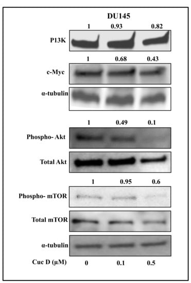 In cancer cells, aberrant expression of PI3K/Akt/mTOR signaling pathway has been associated with enhanced metabolic activities including enhanced uptake of nutrients such as glucose, amino acid [21,22,23,24]. It has been reported that AKT activation is associated with glycolysis stimulation in tumor cells [25]. Further, mTOR is thought to have an important role in metabolic regulation which is indirectly activated by AKT [26]. Therefore, we investigated whether Cuc D inhibits the expression of key effector molecules of these signaling pathways in PrCa cells. Our results demonstrated that Cuc D treatment inhibits the expression of PI3K, c-Myc, AKT and mTOR phosphorylation in a dose-dependent manner in DU145 (Figure 5) cells. Collectively, these results suggest that Cuc D may affect glucose metabolism in PrCa via modulating the aforementioned signaling pathways.