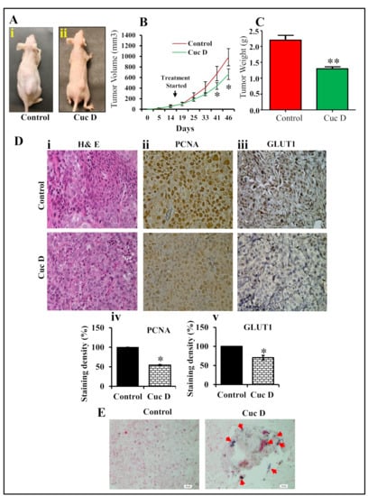 The effect of Cuc D was determined on proliferating cell nuclear antigen (PCNA) and GLUT1 proteins in excised tumors by immnunohistochemistry using Biocare kits (Biocare Medical, Concord, CA, USA). Briefly, the tumor tissues were deparaffinized, rehydrated followed by antigen retrieval using a heat induced technique. Samples were incubated overnight for staining with PCNA and GLUT1 antibodies. The slides were counterstained with hematoxylin, followed by mounting with vecta mount (Vector Laboratories, Burlingame, CA, USA) and visualized.