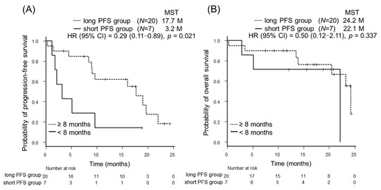| PFS duration of initial TKI | ≥8 months | 15 (88.2) | 8 (80.0) | 0.065 |