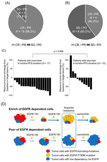 - Yoshimura, A.; Yamada, T.; Okura, N.; Takeda, T.; Furutani, W.; Kubota, Y.; Shiotsu, S.; Hiranuma, O.; Nishioka, N.; Chihara, Y.; et al. The impact of the tumor shrinkage by initial EGFR inhibitors according to the detection of EGFR-T790M mutation in patients with non-small cell lung cancer harboring EGFR mutations. BMC Cancer 2018, 18, 1241. [Google Scholar] [CrossRef] [PubMed]