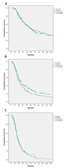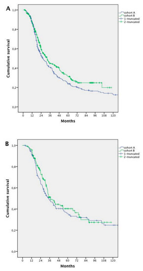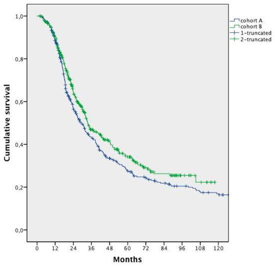 The mOS was 32.0 months (95% confidence interval (CI); 28.8 to 35.3 months). Patients’ survival in Cohort B was significantly longer compared with that in Cohort A (median 33.5 months vs. 29.2 months, respectively, HR 0.832; 95% CI 0.697–0.992; p = 0.041) (Figure 1).