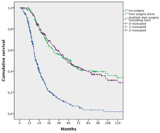 Overall survival analysis of patients who underwent liver surgery vs. surgery of multiple sites (including liver) vs. no surgery.