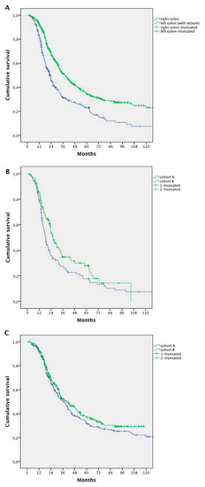 Survival seemed to increase in both left- and right-sided patients in Cohort B compared with Cohort A. However, the difference was statistically significant for right-sided tumours only (18.5 months Cohort A vs. 25.8 months Cohort B, HR 0.738; 95% CI 0.546–0.998; p = 0.044), without changes in the left-sided ones (34.5 months Cohort A vs. 37.5 months Cohort B; HR 0.883; 95% CI 0.638–1.223; p = 0.455) (Figure 4B,C).