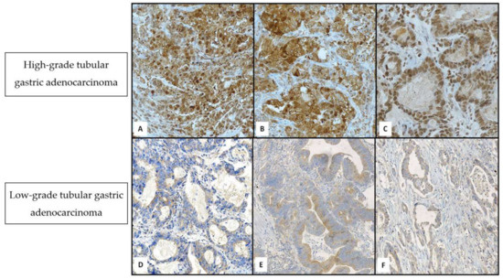 An evident strong and diffuse cytoplasmic and/or nuclear immunoreactivity was encountered in high-grade tubular gastric adenocarcinomas by LC3A/B (A, 160×), Beclin-1 (B, 160×) and AMBRA-1 (C, 200×); by contrast, a slight not uniform staining was found in low-grade cancer with LC3A/B (D, 120×), Beclin-1 (E, 120×) and AMBRA-1 (F, 140×). Nuclear Mayer’s haemalum counterstain.