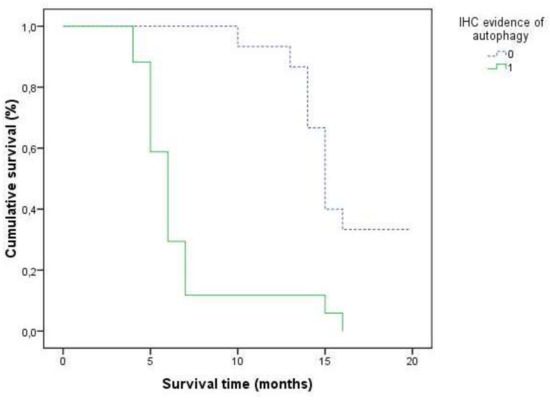 Overall survival curves of all cases of gastric tubular adenocarcinomas in relation to immunohistochemical evidence of autophagy.