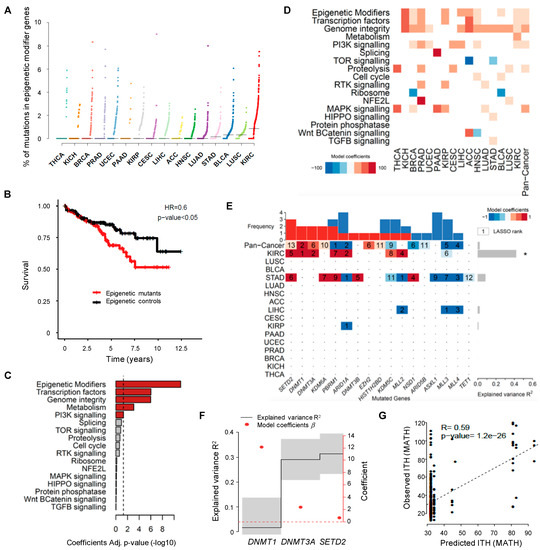 To investigate whether epigenomic deregulation drives the development of tumors with high levels of ITH, we focused our analysis on KIRC, the cancer type with the highest frequency of mutations in epigenetic modifiers (Figure 2A). The important role of epigenomic deregulation in the development and progression of KIRC is illustrated by the finding that patients with mutations in epigenetic modifiers have worse overall survival compared to those without mutations in these genes (p < 0.05, log-rank test; Figure 2B). To investigate how epigenomic deregulation compares with other specific cellular processes in influencing ITH in KIRC, we analyzed significantly mutated genes grouped in broad functional categories as previously described []. The linear model revealed that mutations in epigenetic modifiers are the most strongly associated with high ITH in KIRC, amongst all categories of genes analyzed (Figure 2C). Moreover, the presence of mutations in epigenetic modifier genes correlates positively with increased ITH across different cancer types (Figure 2D and Table S2). Next, we aimed at identifying the individual genes that, when mutated, more accurately predict ITH. To this end, we used generalized linear models previously applied to infer the association of genetic alterations with other phenotypic variables []. The strongest predictor of high ITH in both KIRC alone or across several cancer types was the presence of mutations in SETD2, DNMT1 and DNTM3A (Figure 2E). Importantly, we could model 32% of variability in KIRC ITH using only mutations in SETD2, DNMT1 and DNTM3A (Figure 2F). The optimal model showed a significant correlation between the observed and predicted ITH levels based on the tumor mutation profiles (Figure 2F,G). These data suggest that epigenomic deregulation is an important determinant of ITH and identify mutations in SETD2, DNMT1 and DNTM3A as candidate drivers of ITH.
