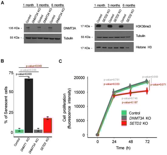 CRISPR/Cas9 knockout of candidate ITH-driver genes in cancer cells. (A) The levels of DNMT3A and H3K36me3 were estimated by western blot 1, 3 and 6 months after knockout. (B) The percentage of senescent cells in control and mutant conditions (SETD2, DNMT1 and DNMT3A knockouts) was assessed by β-galactosidase staining (error bars indicate SEM; n = 3 counting regions of 150 cells/condition in triplicate; Student t-test). (C) The proliferation rate of the indicated cells was measured by AlamarBlue dye reduction at the indicated time points. All data are presented as mean (four technical replicates in the same experiment) ± SEM.