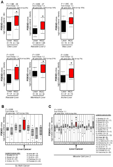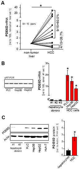In silico analysis of rod-specific photoreceptor cGMP phosphodiesterase (PDE6D) expression in hepatocellular carcinoma (HCC). (A) OncomineTM human cancer microarray database analysis of six patient datasets depicting PDE6D mRNA expression levels in HCCs and non-tumorous livers (* p < 0.05 vs. non-tumorous livers). (B,C) OncomineTM human cancer microarray database analysis of PDE6D expression as detected in large-scale RNA profiling studies comparing diverse carcinomas of different origins (* p < 0.05 vs. average expression).