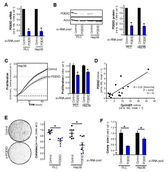 Effects of PDE6D knockdown on HCC proliferation and clonogenicity. Prior to functional experiments, HCC cell lines (PLC, Hep3B) were transfected with si-RNA-pools against PDE6D (“PDE6D”) or the according control-si-RNA-pool (“Control”). (A) PDE6D mRNA levels as quantified by qRT-PCR analysis (* p < 0.05 vs. control). (B) PDE6D protein levels as quantified by Western blot analysis. The left panel depicts an exemplary Western blot image, and the right panel depicts the summarized densitometric quantification (* p < 0.05 vs. control). (C) Real-time cell proliferation (xCELLigence). Exemplary proliferation curves (left panel) and quantified “slopes” (summarizing the proliferative ability) (right panel) are shown (* p < 0.05 vs. control). (D) Relative (to mean) PDE6D as correlated to CyclinD1 mRNA expression levels (qRT-PCR) in human HCC patient tissue samples. (E,F) Anchorage-dependent clonogenic assay (an exemplary image (Hep3B) is depicted in the left panel of (E)). Quantification of colony number (right panel of (E)) and sizes (F) (* p < 0.05).