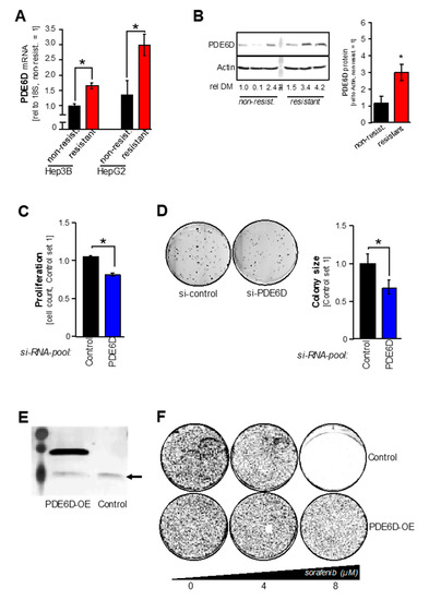 Expression and function of PDE6D in sorafenib resistance. (A) PDE6D mRNA levels as quantified by qRT-PCR analysis in non-resistant (“non-resist.”) as compared to sorafenib-resistant (“resistant”) Hep3B and HepG2 cell clones (* p < 0.05). (B) Exemplary image (left panel) and summarized densitometric quantification (right panel) of Western blot analysis of PDE6D levels in non-resistant (“non-resist.”) as compared to sorafenib-resistant (“resistant”) Hep3B cells (rel DM: relative (PDE6D/Actin) densitometry) (* p < 0.05 vs. non-resist.). (C,D) Prior to functional experiments, resistant cells (Hep3B) were transfected with si-RNA-pools against PDE6D (“PDE6D”) or the according control-si-RNA-pool (“Control”). (C) Depicts relative proliferation (cell numbers) and (D) depicts exemplary clonogenic assays. (E,F) Forced overexpression of PDE6D protein (PDE6D-OE) in HCC cells (e.g., PLC) was performed by transfection of a human PDE6D open reading frame (ORF) Myc-DDK-tagged plasmid vector (an empty control vector without the PDE6D ORF was used as control treatment). (E) Depicts Western blot analysis depicting the overexpressed Myc-DDK-tagged PDE6D protein after PDE6D-OE as well as endogenous (arrow) PDE6D in both PDE6D-OE and control-treated cells. (F) Depicts exemplary images (representing 8 replicate values of 2 independent experiments) of cells cultured in 6-wells for 72 h (100,000 cells were initially seeded per 6-well) and treated with different doses of sorafenib (0, 4, 8 µM).