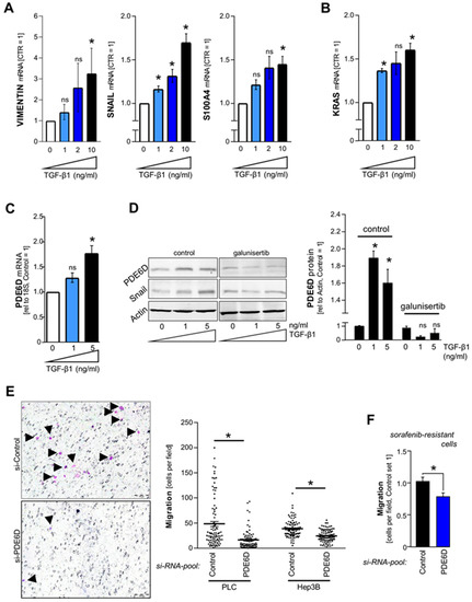 TGF-β signaling and TGF-β-mediated EMT was shown to induce sorafenib resistance by induction of receptor tyrosine kinases and stemness features in HCC [34]. Moreover, TGF-β1-mediated enhanced migration has been described in HCC before [38,39]. Here, we newly found that TGF-β1 signaling upregulated PDE6D expression, and PDE6D inhibition reduced migration in both non-resistant and sorafenib-resistant HCC cells. This finding underscores the potential beneficial effect of galunisertib in the treatment of HCC, as investigated in current clinical trials. Therefore, the question of which intracellular downstream effector(s) of TGF-beta receptor activation (e.g., Smad) could mediate PDE6D upregulation should be addressed in future studies.