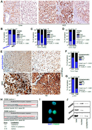 Expression and cellular localization of PDE6D in HCC in vivo and in vitro. (A) PDE6D staining (exemplary images) of non-tumorous liver tissues (left side) and HCC tissues (right side) deposited on the Human Protein Atlas database. (B) Tissue microarray analysis of PDE6D expression levels in human HCC tissues (N = 117) as compared with corresponding non-tumorous liver tissues (N = 127) (Fisher’s exact P < 0.001). (C,D) Tissue microarray analysis of PDE6D expression levels in human HCC tissues correlated with tumor grading (Fisher’s exact P = 0.030) (C) and tumor stages (D). (E) Exemplary immunohistological images of PDE6D protein expression in human HCC samples and corresponding non-tumorous liver tissues applying a tissue microarray revealing nuclear staining next to cytoplasmatic staining patterns (paired samples of two different patients (#1, #2) are depicted). (F,G) Tissue microarray analysis comparing tumor stages (F) and ERK activation (p-ERK) (G) in human HCC tissues with (“yes”) and without (“no”) cytoplasmatic localization pattern of PDE6D. (H) In silico-based analysis of importin-á-dependent nuclear localization signals (NLS, red letters) using the “cNLS Mapper” predicted bipartite NLS in both isoforms of PDE6D (score for both isoforms was 5.3). A legend depicts that higher scores indicate stronger NLS activity and defines major localizations in dependence of each score. (I,J) Exemplary immunofluorescence (I) and Western blot analysis (J) depicting nuclear localization of PDE6D (I) and expression of PDE6D in both nuclear and cytoplasmatic fractions (J) of HCC cell lysates.