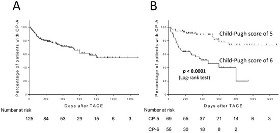 Child-Pugh grade deterioration from A to B after transarterial chemoembolization (TACE) in patients with Child-Pugh grade A (CP-A) (A) and patients with Child-Pugh score of 5 or 6 (B).