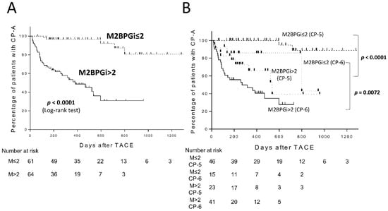 Child-Pugh grade deterioration from A to B after transarterial chemoembolization (TACE) in patients with Child-Pugh grade A (CP-A) according to Mac-2 binding protein glycosylation isomer (M2BPGi) levels (A) and according to M2BPGi levels and Child-Pugh score of 5 (CP-5) or 6 (CP-6) (B).