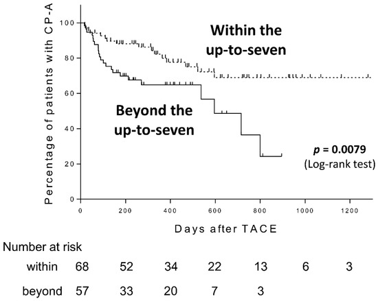 We also found that patients with HCC beyond the up-to-seven criteria (n = 57) had a significantly faster rate of CP grade deterioration compared with those with HCC within the up-to-seven criteria (n = 68) in our cohort (Log-rank test, p = 0.0079, Figure 3).