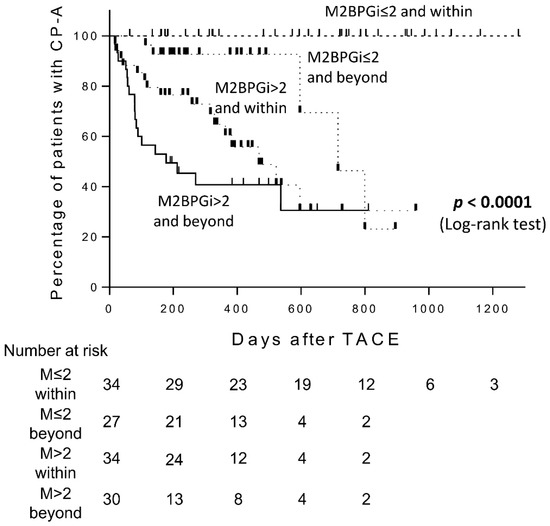 In the present study, we demonstrated for the first time that the combination of serum M2BPGi level and up-to-seven criteria were useful in predicting early CP grade deterioration after TACE. Multivariate analysis revealed that the HRs of CP grade deterioration in elevated M2BPGi levels (>2.00 COI) and beyond the up-to-seven criteria were 12.41 and 1.96, respectively. The cumulative CP grade deterioration rates of patients with M2BPGi > 2.00 COI were 36.2% and 48.9% at six months and one year, respectively, which were significantly higher than those with M2BPGi ≤ 2.00 COI (p < 0.0001). Importantly, the cumulative CP grade deterioration rate was significantly higher in patients with M2BPGi > 2.00 COI, regardless of the CP score. Furthermore, the combination of M2BPGi and up-to-seven criteria showed higher predictive accuracy for CP grade deterioration. The cumulative CP grade deterioration rates of patients with M2BPGi > 2.00 COI and beyond the up-to-seven criteria extended to 50.6% and 59.2% at six months and one year, respectively, which were significantly higher than for any other groups. Although there were 10 patients with CP-5 among patients with M2BPGi > 2.00 COI and beyond the up-to-seven criteria, the cumulative CP grade deterioration rates of these patients were higher than for patients with CP-6. Taken together, the combination of M2BPGi and up-to-seven criteria could be a useful surrogate marker for predicting early CP grade deterioration from A to B after TACE for HCC regardless of the CP score, which may play a role in deciding on an appropriate time to switch to TKIs.