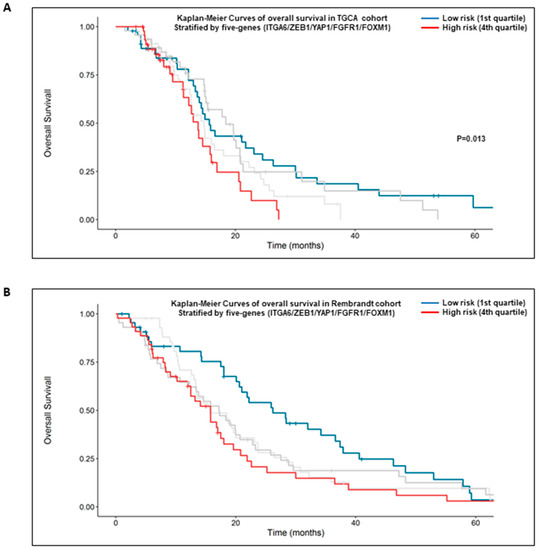 2.6. High Expression of the Five Genes Signature: α6-Integrin/ZEB1/YAP1/FGFR1/FOXM1 Is Prognostic of the Overall Survival of GBM Patients