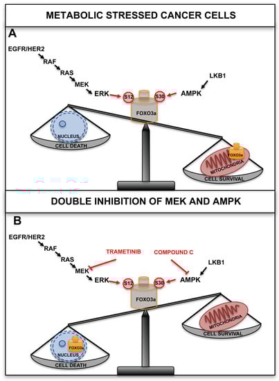 - Celestini, V.; Tezil, T.; Russo, L.; Fasano, C.; Sanese, P.; Forte, G.; Peserico, A.; Lepore Signorile, M.; Longo, G.; De Rasmo, D.; et al. Uncoupling FoxO3A mitochondrial and nuclear functions in cancer cells undergoing metabolic stress and chemotherapy. Cell Death Dis. 2018, 9, 231. [Google Scholar] [CrossRef] [PubMed]