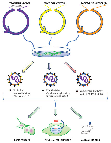 - Naldini, L.; Blömer, U.; Gallay, P.; Ory, D.; Mulligan, R.; Gage, F.H.; Verma, I.M.; Trono, D. In vivo gene delivery and stable transduction of nondividing cells by a lentiviral vector. Science 1996, 272, 263–267. [Google Scholar] [CrossRef]