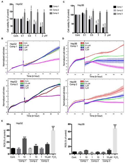 Selected derivatives suppress human hepatocellular carcinoma (HCC) cell viability and growth. (A,C) Cells were exposed to different concentrations of compounds for 24 h and cell viability was measured using MTS assays (HepG2 in A and Hep3B in C). Values (means ± SDs) were obtained from at least three independent experiments. There was a significant decrease in cell viability in cells treated with compounds compared with controls (* p < 0.05, ** p < 0.01, *** p < 0.001). (B,D) Cells were treated with compounds 1 and 2 and cell growth was dynamically monitored using impedance technology (HepG2 in B and Hep3B in D). Normalized cell index values measured over 70 h are shown. (E) The percent change in intracellular reactive oxygen species (ROS) generation was measured after cells were treated for 1 h with selected derivatives.